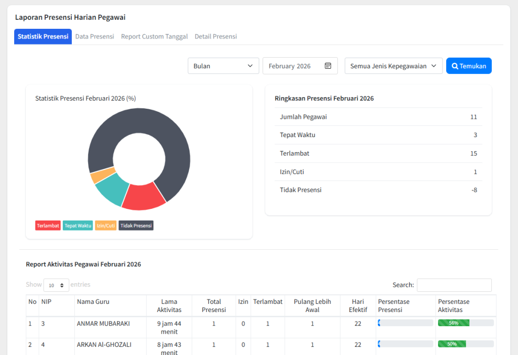Data yang diperoleh dari hasil presensi siswa tersimpan dan terkoneksi secara realtime, sehingga pihak sekolah dapat memantau progress dari presensi harian siswa secara berkala baik harian, mingguan, bulanan, dan bahkan by rentang tanggal tertentu. Jika sekolah menerapkan semua metode yang ada maka siswa bebas memilih dengan metode mana siswa akan melakukan presensi mandiri.