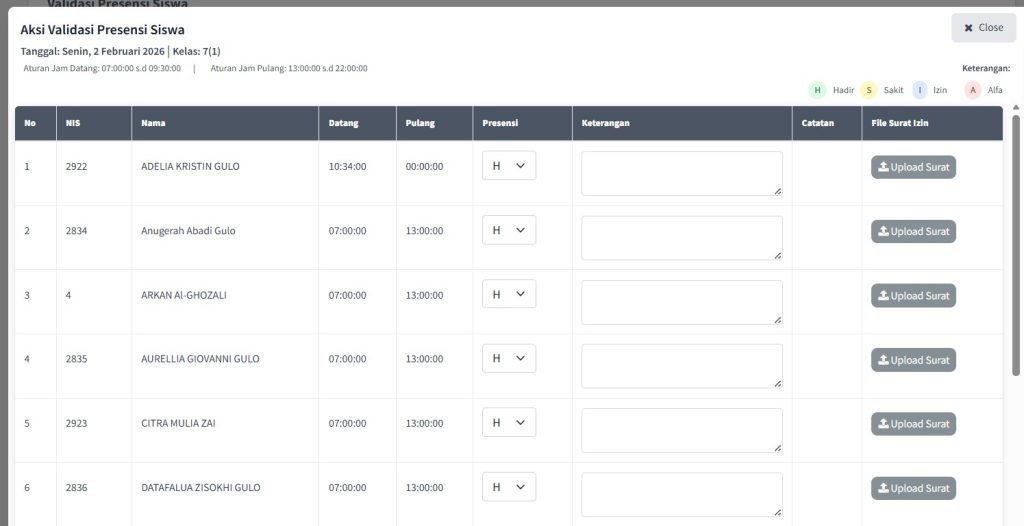 5. Validasi oleh guru piket atau petugas absen (jika siswa tidak diberikan izin absen mandiri maka guru juga bisa menandai via aplikasi mangement).